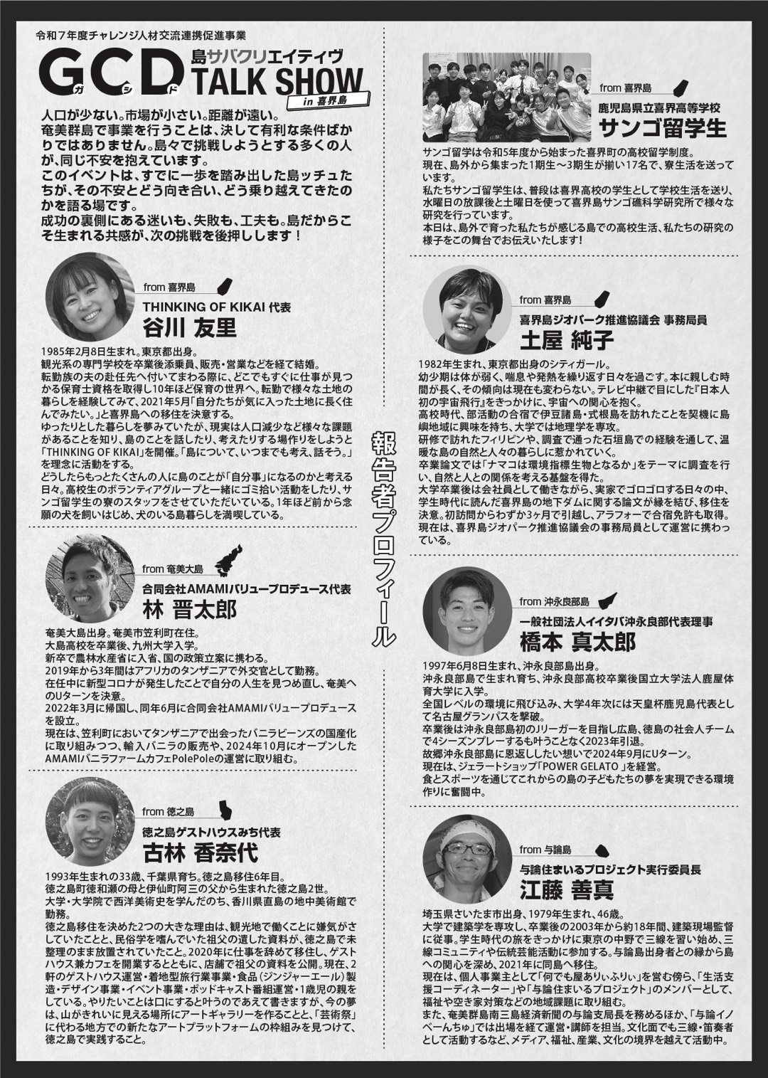 奄美群島においてチャレンジしている方々にスポットを当てたもので、奄美群島における島の物事の可能性にチャレンジしている方々にご登壇いただき、それぞれの方が現在取り組んでいる事の発表やその過程での苦労話、あるいは、奄美に対する想いなどをお話いただくイベントとなっております。